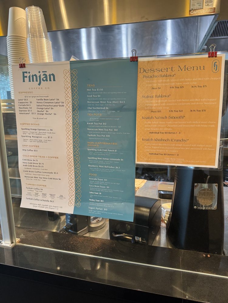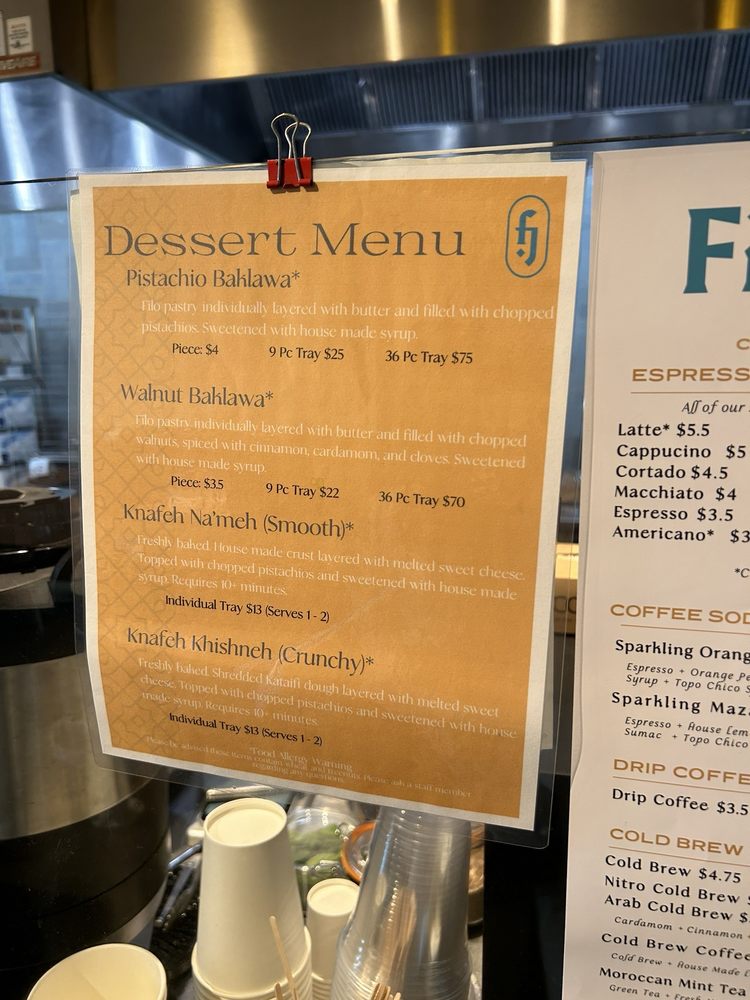 The menu features a variety of coffee options, including classics like espresso and cappuccino, as well as specialty drinks like the Honey Cinnamon Latte. Pair your drink with a freshly baked Knafeh for a sweet and savory treat that will transport your taste buds to the Middle East.